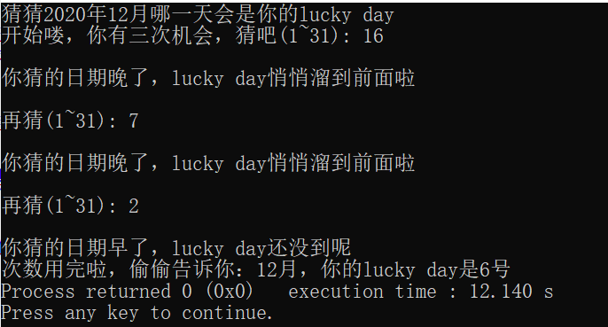#include <stdio.h> #include <time.h> #include <stdlib.h> int main(){ int x,i,date = 6; srand((unsigned)time(NULL)); x = rand()%31 + 1; printf("猜猜2020年12月哪一天会是你的lucky day\n"); printf("开始喽,你有三次机会,猜吧(1~31): "); for(i = 1;i <= 3;i++) { scanf("%d",&x); if(x > date) {printf("\n你猜的日期晚了,lucky day悄悄溜到前面啦\n"); } else if(x < date) {printf("\n你猜的日期早了,lucky day还没到呢\n");} if(i != 3){ printf("\n再猜(1~31): ");} } printf("次数用完啦,偷偷告诉你:12月,你的lucky day是6号"); return 0; }