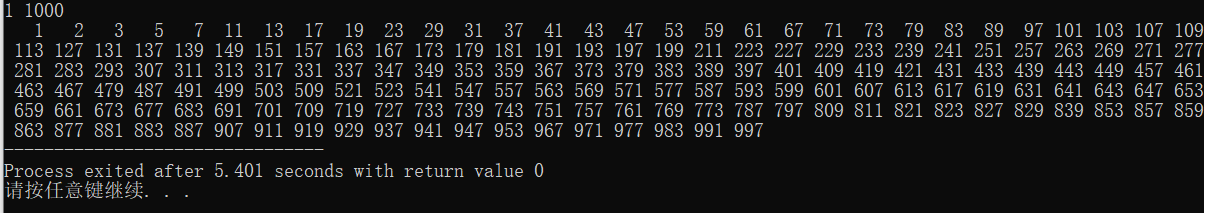 //3 #include<stdio.h> #define N 1000 int fun(int n,int m,int bb[N]){ int i,j,k=0,flag; for(j=n;j<=m;j++){ flag=1; for(i=2;i<j;i++) if(j%i==0){ flag=0; break; } if(flag) bb[k++]=j; } return k; } int main(){ int n=0,m=0,i,k,bb[N]; scanf("%d",&n); scanf("%d",&m); for(i=0;i<m-n;i++) bb[i]=0; k=fun(n,m,bb); for(i=0;i<k;i++) printf("%4d",bb[i]); return 0; }