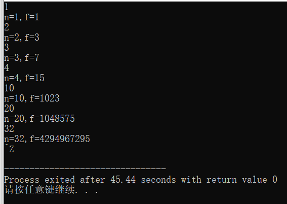 #include<stdio.h> long long fun(int n); int main(){ int n; long long f; while(scanf("%d",&n)!=EOF){ f=fun(n); printf("n=%d,f=%lld\n",n,f); } return 0; } long long fun(int n){ long long f; if(n==0) f=0; else f=(fun(n-1)+1)*2-1; return f; }