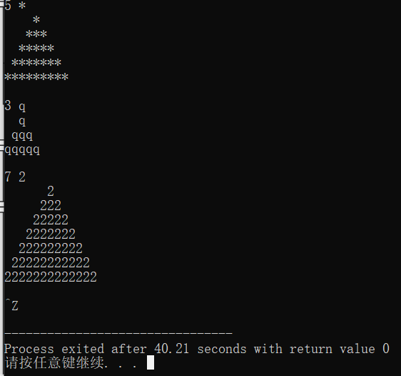 //5 #include<stdio.h> void draw(int n,char symbol); int main(){ int n,symbol; while(scanf("%d %c",&n,&symbol)!=EOF){ draw(n,symbol); printf("\n"); } return 0; } void draw(int n,char symbol){ int j,i,line=1; for(i=1;i<=n;i++){ line=i; for(j=1;j<=n-line;j++) printf(" "); line=2*i-1; for(j=1;j<=line;j++) printf("%c",symbol); printf("\n"); } }