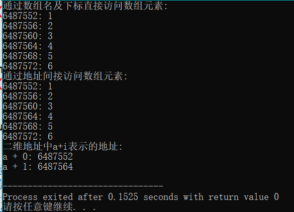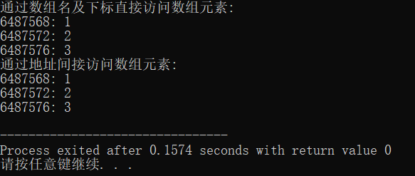 //1 #include <stdio.h> const int N=3; int main() { int a[N] = {1, 2, 3}; int i; printf("通过数组名及下标直接访问数组元素:\n"); for(i=0; i<N; i++) printf("%d: %d\n", &a[i], a[i]); printf("通过地址间接访问数组元素:\n"); for(i=0; i<N; i++) printf("%d: %d\n", a+i, *(a+i)); return 0; } //数组元素在内存中是连续存在的 //在一维数组中方式是等价的,但二位数组不是等价的
