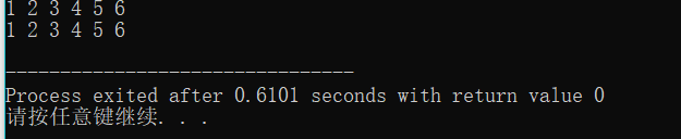 // 4.1 #include <stdio.h> int main() { int a[2][3] = {1,2,3,4,5,6}; int i,j; int *p; int (*q)[3]; // q是指针变量,存放包含有3个元素的一维数组的地址 for(p=a[0]; p<a[0]+6; p++) printf("%d ", *p); printf("\n"); for(q=a; q<a+2; q++) for(j=0; j<3; j++) printf("%d ", *(*q+j)); printf("\n"); return 0; }