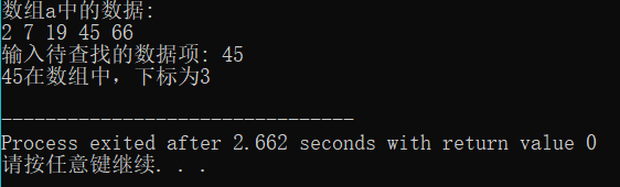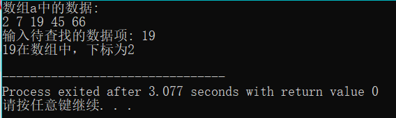 // 5.1 #include <stdio.h> const int N=5; int binarySearch(int x[], int n, int item); int main() { int a[N]={2,7,19,45,66}; int i,index, key; printf("数组a中的数据:\n"); for(i=0;i<N;i++) printf("%d ",a[i]); printf("\n"); printf("输入待查找的数据项: "); scanf("%d", &key); index=binarySearch(a,N,key); if(index>=0) printf("%d在数组中,下标为%d\n", key, index); else printf("%d不在数组中\n", key); return 0; } int binarySearch(int x[], int n, int item) { int low, high, mid; low = 0; high = n-1; while(low <= high) { mid = (low+high)/2; if (x[mid]==item) return mid; else if(x[mid]>item) high = mid - 1; else low = mid + 1; } return -1; }