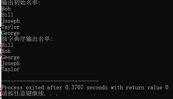 //6.2 #include <stdio.h> #include <string.h> const int N = 5; void selectSort(char str[][20], int n ); int main() { char name[][20] = {"Bob", "Bill", "Joseph", "Taylor", "George"}; int i; printf("输出初始名单:\n"); for(i=0; i<N; i++) printf("%s\n", name[i]); selectSort(name, N); printf("按字典序输出名单:\n"); for(i=0; i<N; i++) printf("%s\n", name[i]); return 0; } void selectSort(char str[][20], int n) { int i,j,k; char temp[20]; for(i=0;i<n;i++) { k=i; for(j=i+1;j<n;j++) if(strcmp(str[i],str[j])>0) k=j; if(k!=j) { strcpy(temp,str[i]); strcpy(str[i],str[k]); strcpy(str[k],temp); } } }