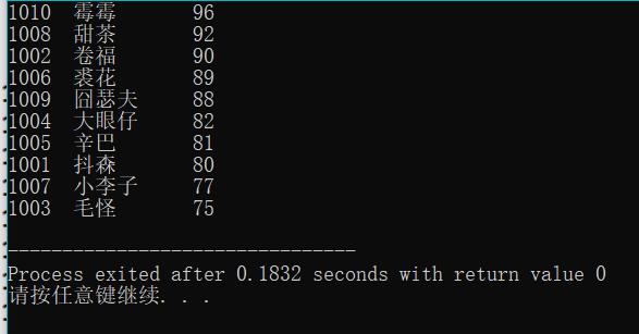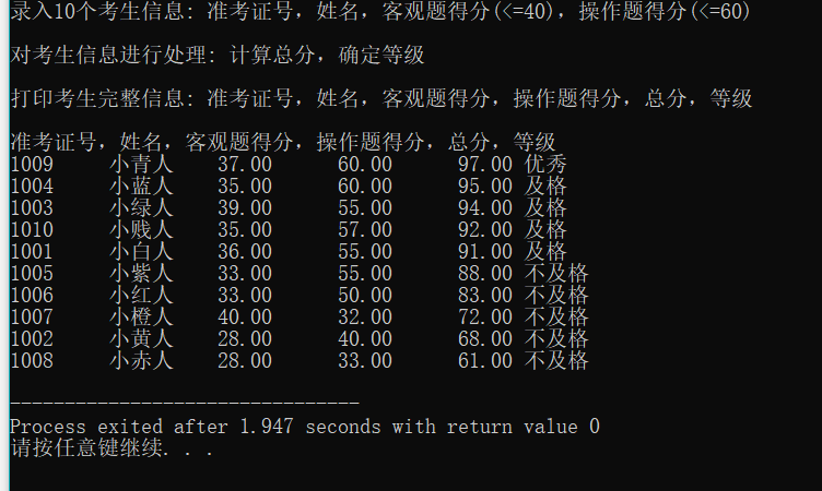 #include<stdio.h> #include<string.h> #include<stdlib.h> const int N = 10; typedef struct student { long int id; char name[20]; float objective; float subjective; float sum; char level[10]; }STU; void input(STU s[], int n); void output(STU s[], int n); void process(STU s[], int n); int main() { STU stu[N]; printf("录入%d个考生信息: 准考证号,姓名,客观题得分(<=40),操作题得分(<=60)\n", N); input(stu, N); printf("\n对考生信息进行处理: 计算总分,确定等级\n"); process(stu, N); printf("\n打印考生完整信息: 准考证号,姓名,客观题得分,操作题得分,总分,等级\n"); output(stu, N); return 0; } void input(STU s[], int n) { FILE *fp; int i; fp=fopen("examinee.txt","r"); if(!fp){ printf("fail to open file1.dat\n"); exit(0); } for(i=0;i<n;i++) fscanf(fp,"%d %s %f %f",&s[i].id,s[i].name,&s[i].objective,&s[i].subjective); fclose(fp); } void output(STU s[], int n) { FILE *fp; int i; fp=fopen("result.txt","w"); printf("\n准考证号,姓名,客观题得分,操作题得分,总分,等级\n"); for(i=0;i<n;i++){ printf("%-8ld %-9s %.2f %10.2f %10.2f %s\n",s[i].id,s[i].name,s[i].objective,s[i].subjective,s[i].sum,s[i].level); fprintf(fp,"%ld %s %f %f %f %s\n",s[i].id,s[i].name,s[i].objective,s[i].subjective,s[i].sum,s[i].level); } fclose(fp); } void process(STU s[], int n) { STU *pi, *pj, t; int i; for(i=0;i<n;i++) s[i].sum=s[i].objective+s[i].subjective; for(pi = s; pi < s+n-1; pi++) for(pj = pi+1; pj < s+n; pj++) if(pi->sum < pj->sum) { t = *pi; *pi = *pj; *pj = t; } for(i=0;i<n;i++){ if(i+1<=0.1*n) strcpy(s[i].level,"优秀"); else if(i+1<=0.5*n&&i+1>0.1*n) strcpy(s[i].level,"及格"); else strcpy(s[i].level,"不及格"); } }