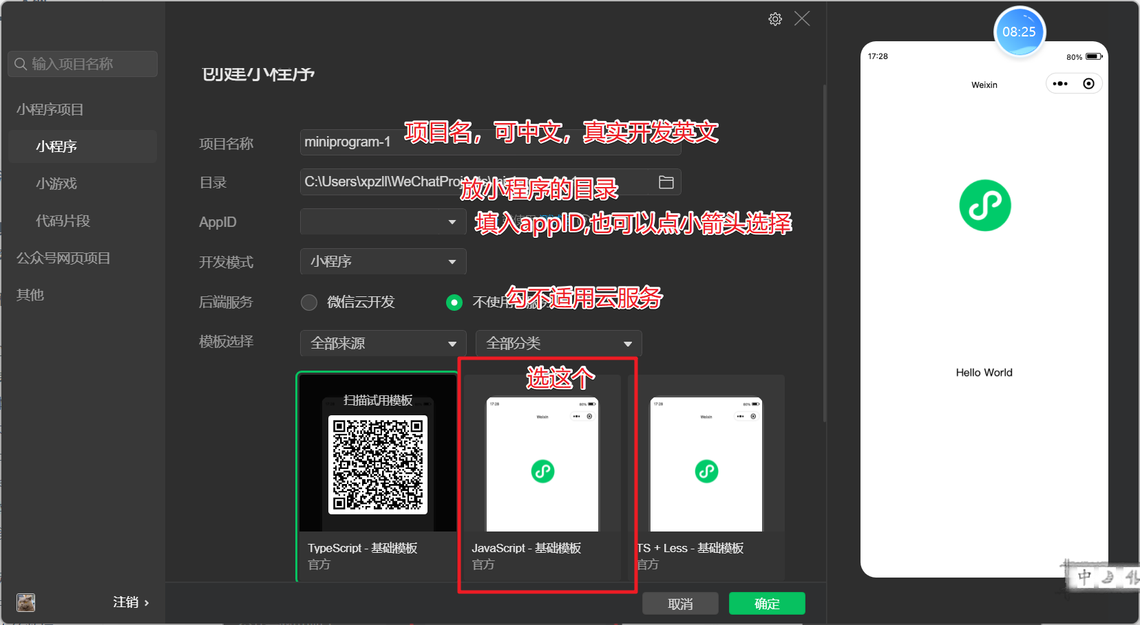 使用开发者工具新建第一个小程序项目