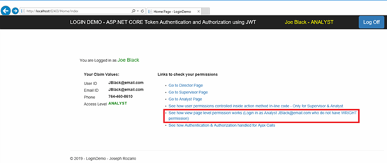 要检查授权,请以具有Analyst角色的JBlack@email.com登录到演示项目。在此演示中,Ajax调用仅适用于Director和Supervisor。Analyst没有Ajax调用的权限,因此他们将被重定向到“No Permission”页面。登录后,单击链接“查看如何处理Ajax调用的身份验证和授权”。在下一页中,单击“授权Ajax调用”。由于JBlack@email.com是Analyst,所以他没有权限,将被重定向到“No Permission”页面。
