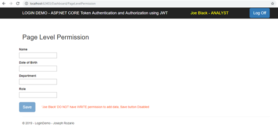 操作方法用[Authorize]特性修饰。我们将用户角色作为参数传递。Director,Supervisor和Analyst每个都具有单独的操作方法。
