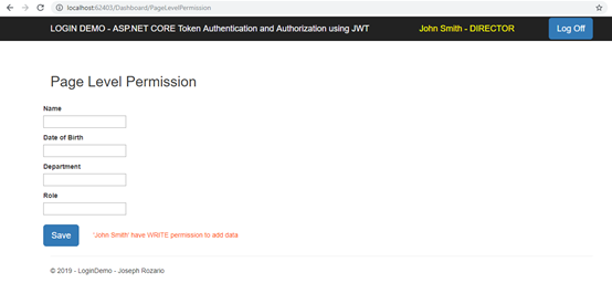 在此'DirectorPage'操作方法中,我们使用Roles.DIRECTOR设置了Authorize特性。这意味着,只有具有Director角色的用户才能查看此页面。如果Supervisor或Analyst尝试访问该页面,则它们将从AuthorizeFilter类中重定向到“No Permission”页面。