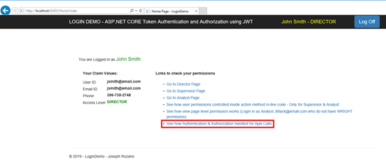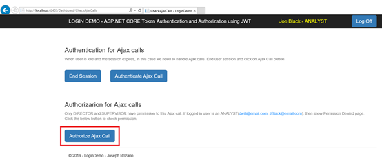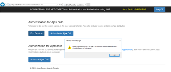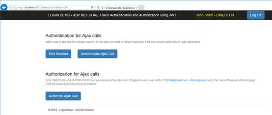 在演示项目中,有一个页面CheckAjaxCalls.cshtml,您可以在其中检查Ajax调用的身份验证/授权。要检查身份验证,请以Director jsmith@email.com登录到演示项目。您应该看到以下页面。
