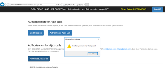 如果您以Director或Supervisor身份登录,则在单击“Authorize Ajax Call” 时会看到一条警告消息。