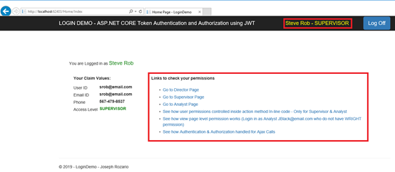 Roles.DIRECTOR是我们要传递给AuthorizeFilter类的参数。Authorize过滤器类采用“Roles.DIRECTOR”参数值,并检查是否在User Claims Identity集合中找到该值。如果找到了,则允许用户通过操作方法,并且允许用户看到“DirectorPage”。如果登录的用户是Supervisor 或Analyst,则他们将看不到“DirectorPage”。