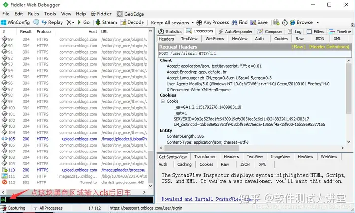 在点击登录按钮的时候,不要做多余的操作了,然后查看fiddler会话框,这时候有好几个请求。