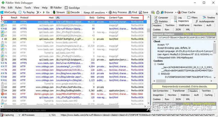 - 第三块左边是抓捕的请求会话列表,每一个请求就是一个会话
