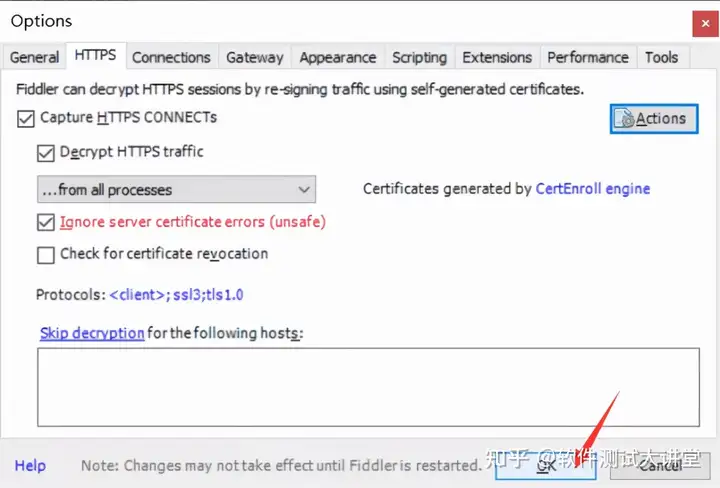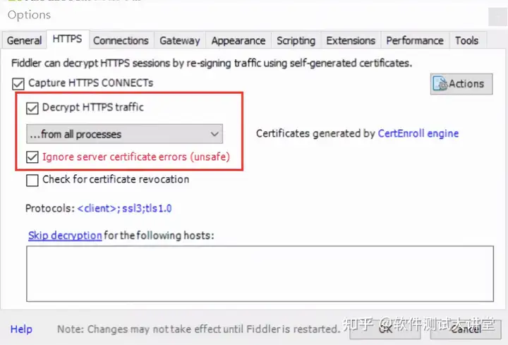 在Options窗口HTTPS选项卡,依次勾选“Decrypt HTTPS traffic”、“Ignore server certificate errors(unsafe)”