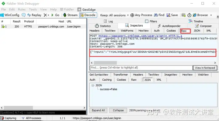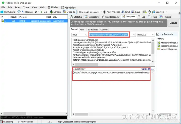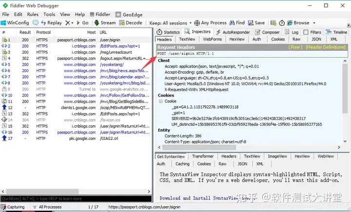 2.输入账号和密码登录成功后,查看fiddler抓包的请求头信息,可以看出是post请求