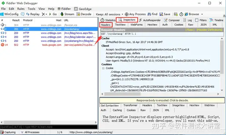2.点开右侧Inspectors下的Headers区域,查看Request Headers