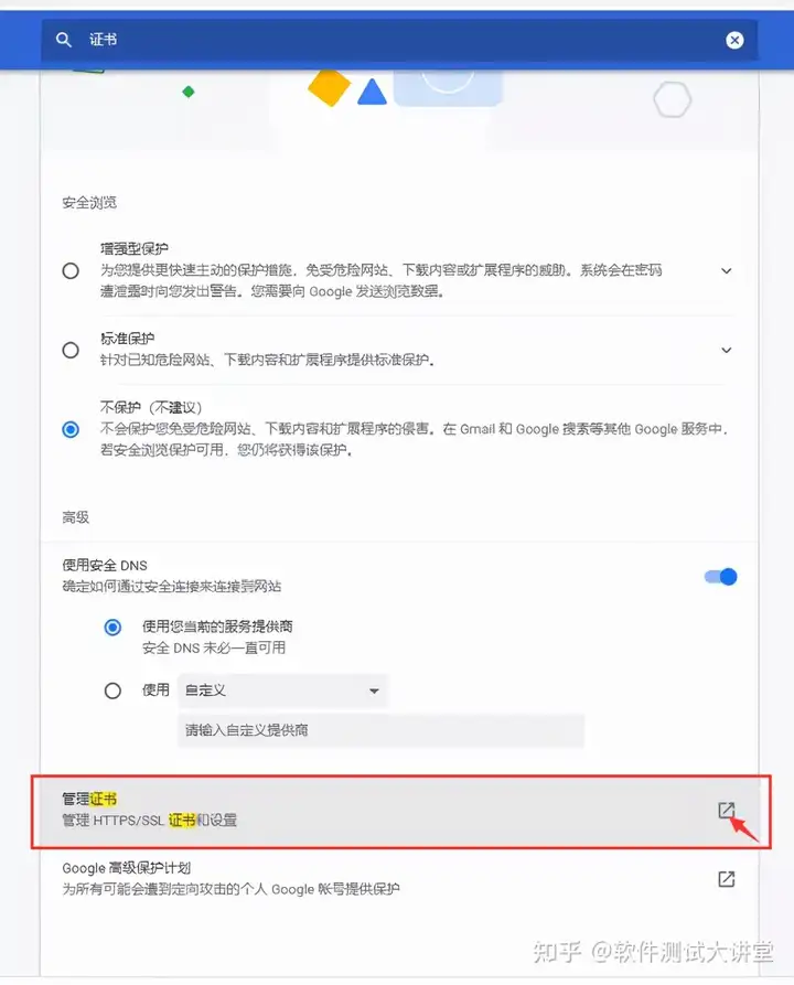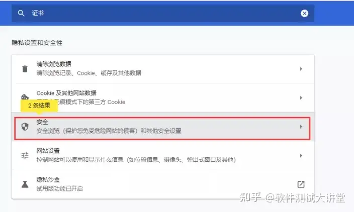 - 清除浏览器证书文件在浏览器地址框输入 chrome://settings/,然后在搜索框输入 搜索关键字,在证书窗口中,点选项卡“受信任的根证书颁发机构”,找到带FiddlerRoot字样的记录删除掉。