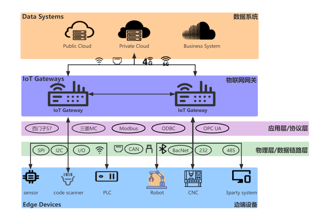 工业物联网网关(IIoTGateway)是一种硬件设备或软件程序,作为 本地设备(如PLC、扫码枪、机器人、数控机床、非标上位机等)与 云端系统(如物联网平台、SCADA系统、MES系统等)之间的 桥梁,在设备和云端之间流动的所有数据都通过IoT网关,如下图所示: