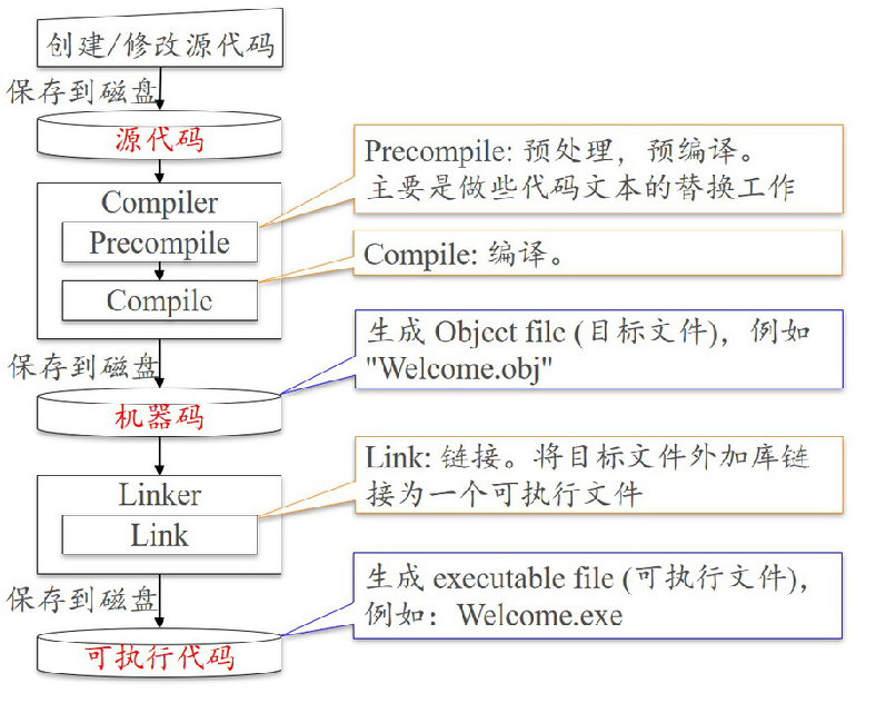 编译时,先由预处理器对指令(#include、#define、#ifdef,#ifndef,#else,#elif,#endif等)进行预处理,在内存中输出翻译单元(就是将include等在源文件上替换了以后产生的临时文件),比如说·#define m 5,那么在该阶段会将程序中的m全部替换成5。然后,编译器接受临时文件,将其编译成包含机器语言指令的目标文件(.obj)。接下去就是链接过程(Linking...),连接器将目标文件和你用到的相关库文件一起链接形成main.exe。