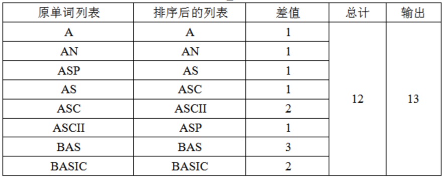 - 依次计算每个单词对前一单词的差,并把差累加起来。注意:第 一个单词相对于“空”的差为该单词的长度;