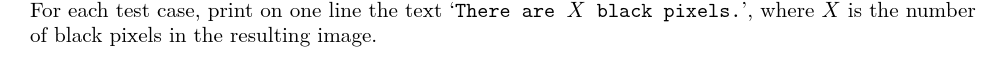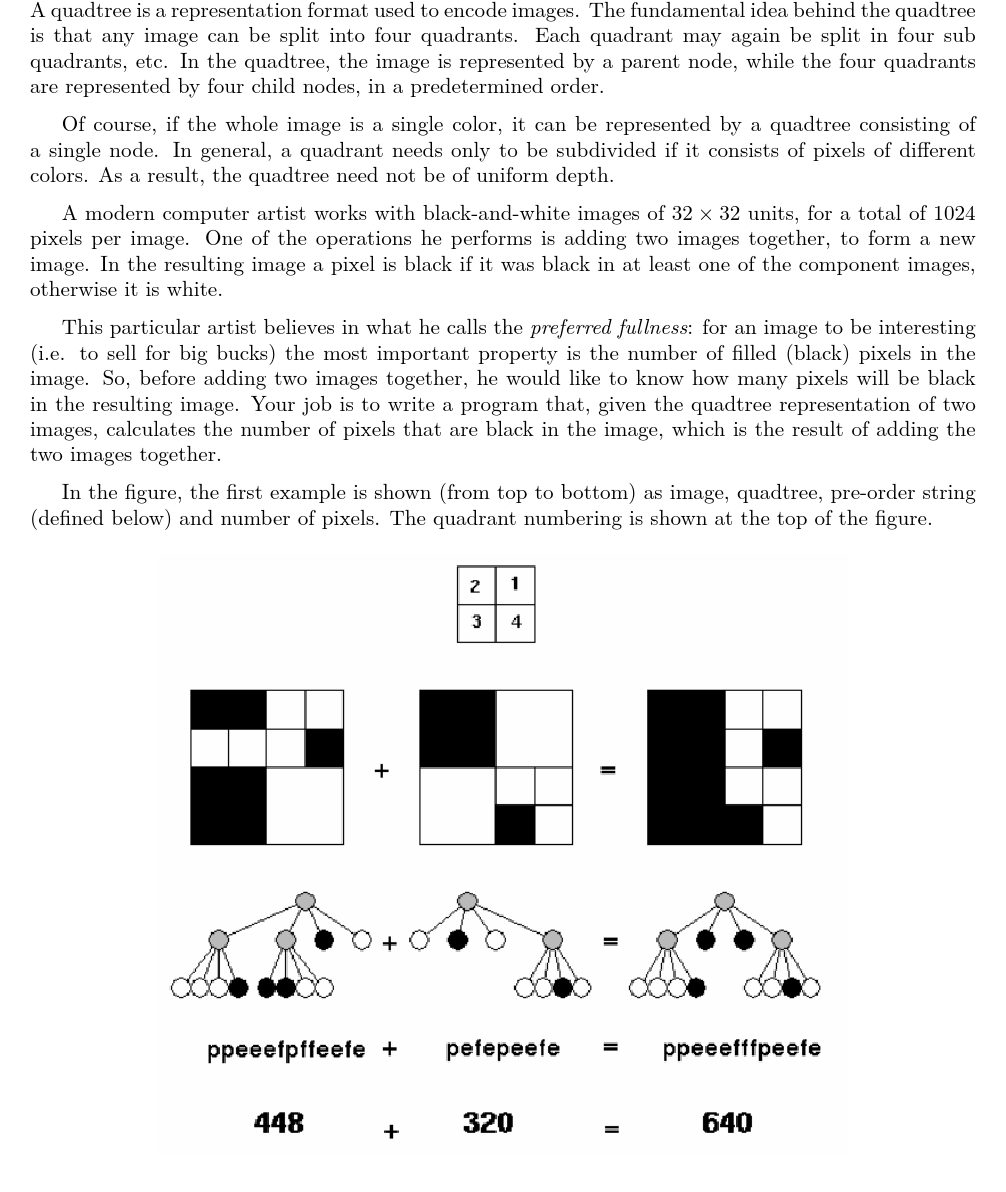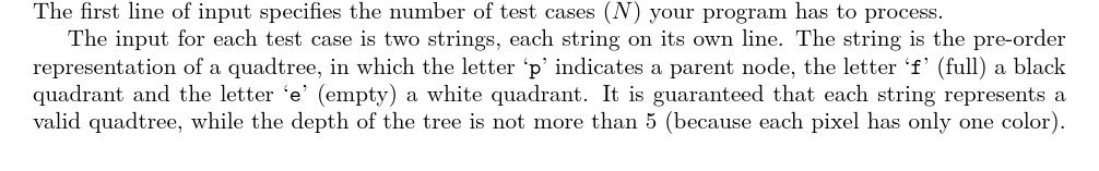 #include <iostream> #include <cstring> using namespace std; const int len = 32; const int maxn = 1024 + 10; char s[maxn]; int buf[len][len], cnt; /* 把字符串 s[p..] 导出到以 {r , c} 为左上角,边长为 w 的缓冲区中 2 1 3 4 */ void draw(const char *s, int &p, int r, int c, int w) { char ch = s[p++]; if (ch == 'p') { draw(s, p, r, c + w / 2, w / 2); //1 draw(s, p, r, c, w / 2); //2 draw(s, p, r + w / 2, c, w / 2); //3 draw(s, p, r + w / 2, c + w / 2, w / 2); //4 } else if (ch == 'f') { //画黑像素(白像素不画) for (int i = r; i < r + w; i++) { for (int j = c; j < c + w; j++) { if (buf[i][j] == 0) { buf[i][j] = 1; cnt++; } } } } } int main() { int T; scanf("%d", &T); while (T--) { memset(buf, 0, sizeof(buf)); cnt = 0; for (int i = 0; i < 2; i++) { scanf("%s", s); int p = 0; draw(s, p, 0, 0, len); } printf("There are %d black pixels.\n", cnt); } return 0; }