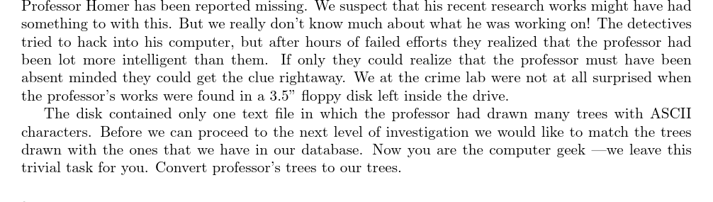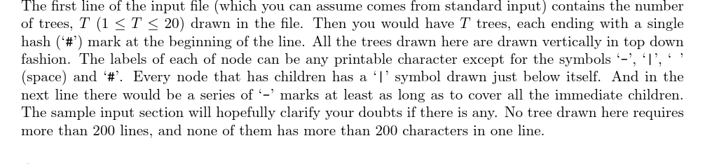 #include <iostream> #include <cstdio> #include <cstring> #include <cctype> using namespace std; const int maxn = 200 + 10; int n; char buf[maxn][maxn]; //递归遍历并且输出以字符buf[r][c]为根的树 void dfs(int r, int c) { printf("%c(", buf[r][c]); if (r + 1 < n && buf[r + 1][c] == '|') //有子树 { int i = c; while (i - 1 >= 0 && buf[r + 2][i - 1] == '-') // 找“----”的左边界 i--; while (buf[r + 2][i] == '-' && buf[r + 3][i] != '\0') { if (!isspace(buf[r + 3][i])) //fgets读入的“\n”也满足isspace(); dfs(r + 3, i); i++; } } printf(")"); } void solve() { n = 0; for (;;) { fgets(buf[n], maxn, stdin); if (buf[n][0] == '#') break; else n++; } printf("("); if (n) { for (int i = 0; i < strlen(buf[0]); i++) if (buf[0][i] != ' ') { dfs(0, i); break; } } printf(")\n"); } int main() { int T; fgets(buf[0], maxn, stdin); sscanf(buf[0], "%d", &T); while (T--) solve(); return 0; }