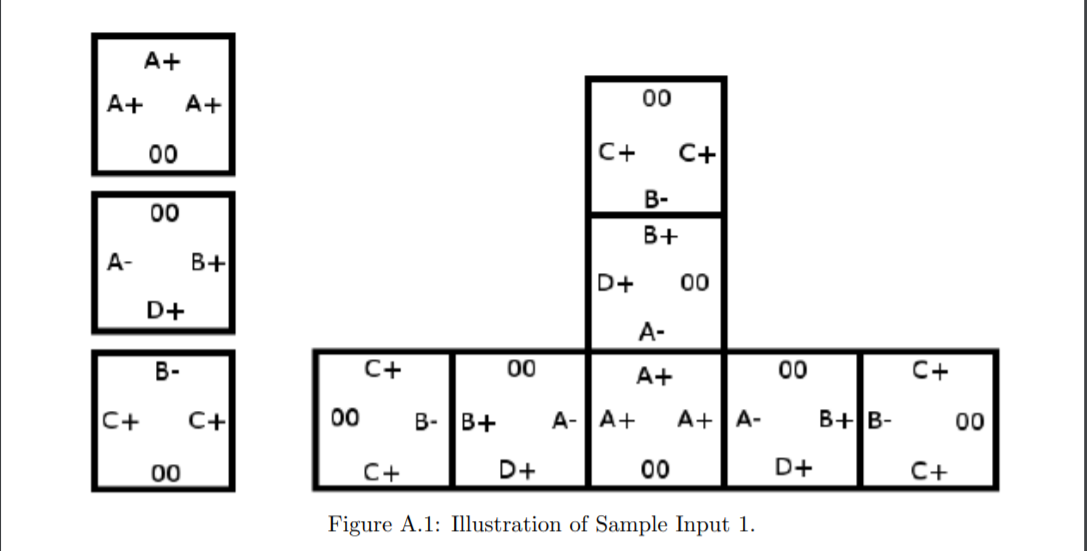 In each test case, you will be given a set of molecule descriptions. Each type of molecule is described by four two-character connector labels that indicate how its edges can connect to the edges of other molecules. There are two types of connector labels:
