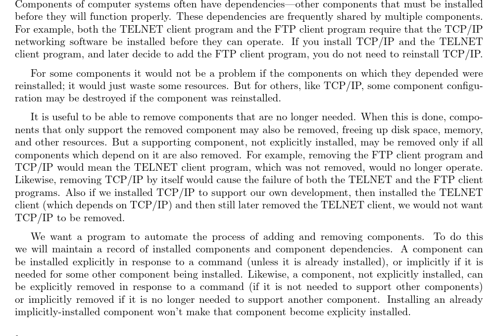 DEPEND TELNET TCPIP NETCARD DEPEND TCPIP NETCARD DEPEND DNS TCPIP NETCARD DEPEND BROWSER TCPIP HTML INSTALL NETCARD INSTALL TELNET INSTALL foo REMOVE NETCARD INSTALL BROWSER INSTALL DNS LIST REMOVE TELNET REMOVE NETCARD REMOVE DNS REMOVE NETCARD INSTALL NETCARD REMOVE TCPIP REMOVE BROWSER REMOVE TCPIP END