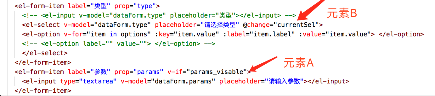 1、在前端页面中写一个currentSel方法,方法中根据元素所选值给参数params_visable赋值(注意与前后其他方法的格式):