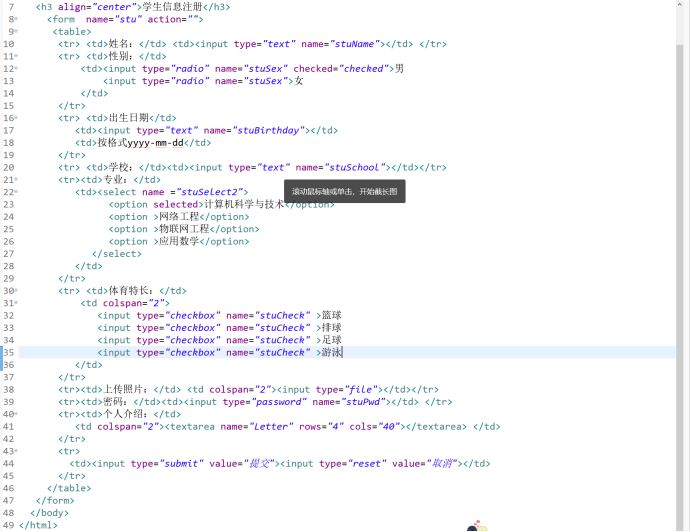 密码域 | <input type="password" name="密码字段名称" size=" " maxlength=" " value=" " > | 当用户输入密码时,区域内将会显示“*”号代替用户输入的内容 |