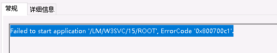 1、错误信息(附截图):Failed to start application '/LM/W3SVC/15/ROOT', ErrorCode '0x800700c1'.