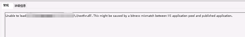 3、错误信息(附截图):Unable to load 'D:\apricot\.\hostfxr.dll'. This might be caused by a bitness mismatch between IIS application pool and published application.