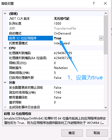 4、问题处理及解决:IIS应用程序池【项目对应程序池】->高级设置->启用32位应用程序=>true