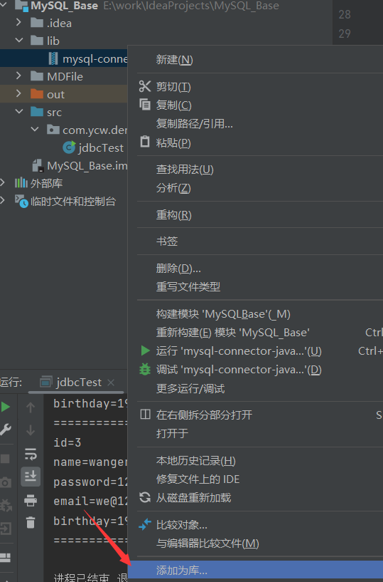 创建lib目录,将mysql-connector-java-8.0.26.jar文件拖拽至lib目录下,再右键文件添加为库