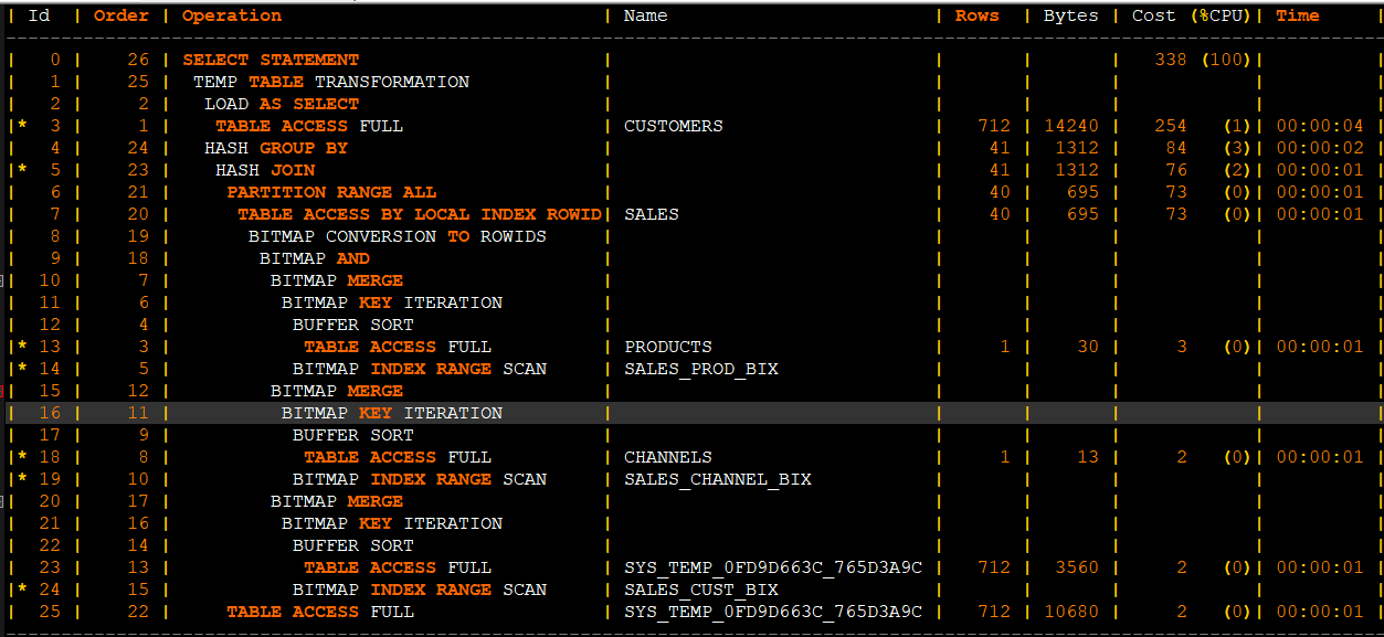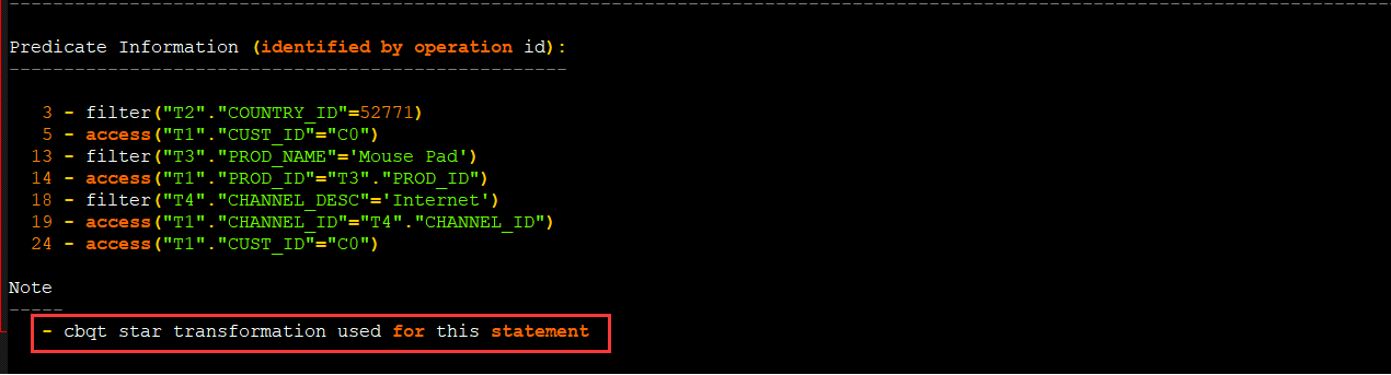 Plan hash value: 3295561841 -------------------------------------------------------------------------------------------------- | Id | Operation | Name | Rows | Bytes | Cost (%CPU)| Time | Pstart| Pstop | -------------------------------------------------------------------------------------------------- | 0 | SELECT STATEMENT | | 1 | 13 | 425K (6)| 01:25:09 | | | |* 1 | FILTER | | | | | | | | | 2 | TABLE ACCESS FULL | CUSTOMERS | 55500 | 704K| 254 (1)| 00:00:04 | | | | 3 | PARTITION RANGE ALL| | 2 | 20 | 10 (10)| 00:00:01 | 1 | 28 | |* 4 | TABLE ACCESS FULL | SALES | 2 | 20 | 10 (10)| 00:00:01 | 1 | 28 | -------------------------------------------------------------------------------------------------- Predicate Information (identified by operation id): --------------------------------------------------- 1 - filter( EXISTS (SELECT /*+ NO_UNNEST */ 0 FROM "SH"."SALES" "T2" WHERE "CUST_ID"=:B1 AND "T2"."AMOUNT_SOLD">700)) 4 - filter("CUST_ID"=:B1 AND "T2"."AMOUNT_SOLD">700)
