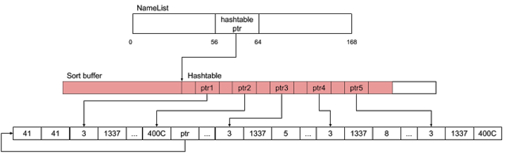 将513元素添加到前1000个对象中,导致1000个8192字节哈希表的分配。使用长度为300和170个元素的数组触发Array.sort。这将分配一个大小为(170 + 1)* 48 = 8208字节的缓冲区。由于LFH的粒度,这个对象将被分配在与8192字节哈希表相同的LFH中。