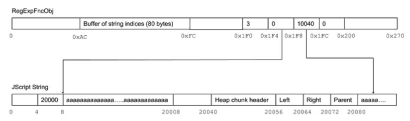 对于infoleak,我们要在RegExp.lastParen中使用这个bug。为了理解这个bug,我们先来仔细看看jscript!RegExpFncObj的内存布局,它对应于JScript RegExp对象。在偏移量0xAC处,RegExpFncObj包含20个整数的缓冲区。实际上这些是10对整数:第一个元素是输入字符串的起始索引,第二个元素是结束索引。只要RegExp.test,RegExp.exec 或带有RegExp参数的String.search遇到捕获组(RegExp语法中的圆括号),匹配到的开始和结束索引就会存储在这里。显然在缓冲区中只有10个匹配的空间,所以只有前10个匹配组被存储在这个缓冲区中。