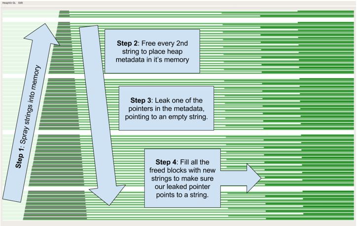 infoleak的目的是获得我们完全控制的字符串的内存地址。此时我们不会泄露任何可执行的模块地址,这将在稍后进行。相反,其目标是挫败高熵堆的随机化,使第二阶段的利用可靠,而不必使用堆喷射。