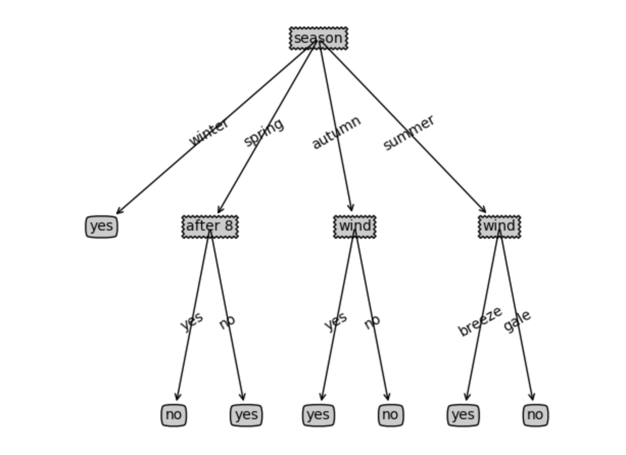 第一条公式中pk表示的是每个属性的可选值,将这些可选值计算后累加。这条公式和信息增益的结果其实是类似的,当属性分布越平均,也就是信息越模糊的时候,基尼系数值会更大,反之则更小。但这种计算方法,每次都只用二分分类的方式进行计算。比如说上面例子中的季节属性,有春夏秋冬四个可选值(春,夏,秋,冬)。那么计算春季的时候就会按二分的方式计算(春,(夏,秋,冬))。而后面其他步骤与ID3类似。通过这种计算,可以较好得规避ID3决策树的缺陷。
