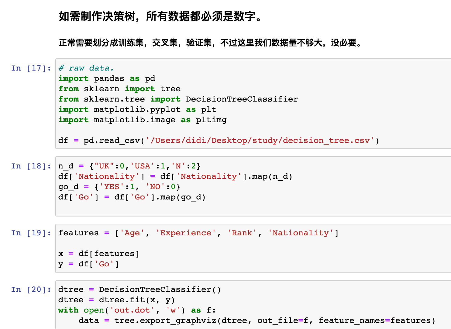 利用sklearn实例化一个决策树,调参决策树模型的各个参数,并且使用sklearn模型对上一节中的例子训练出一个决策树模型,然后用Graphviz让决策树模型可视化。