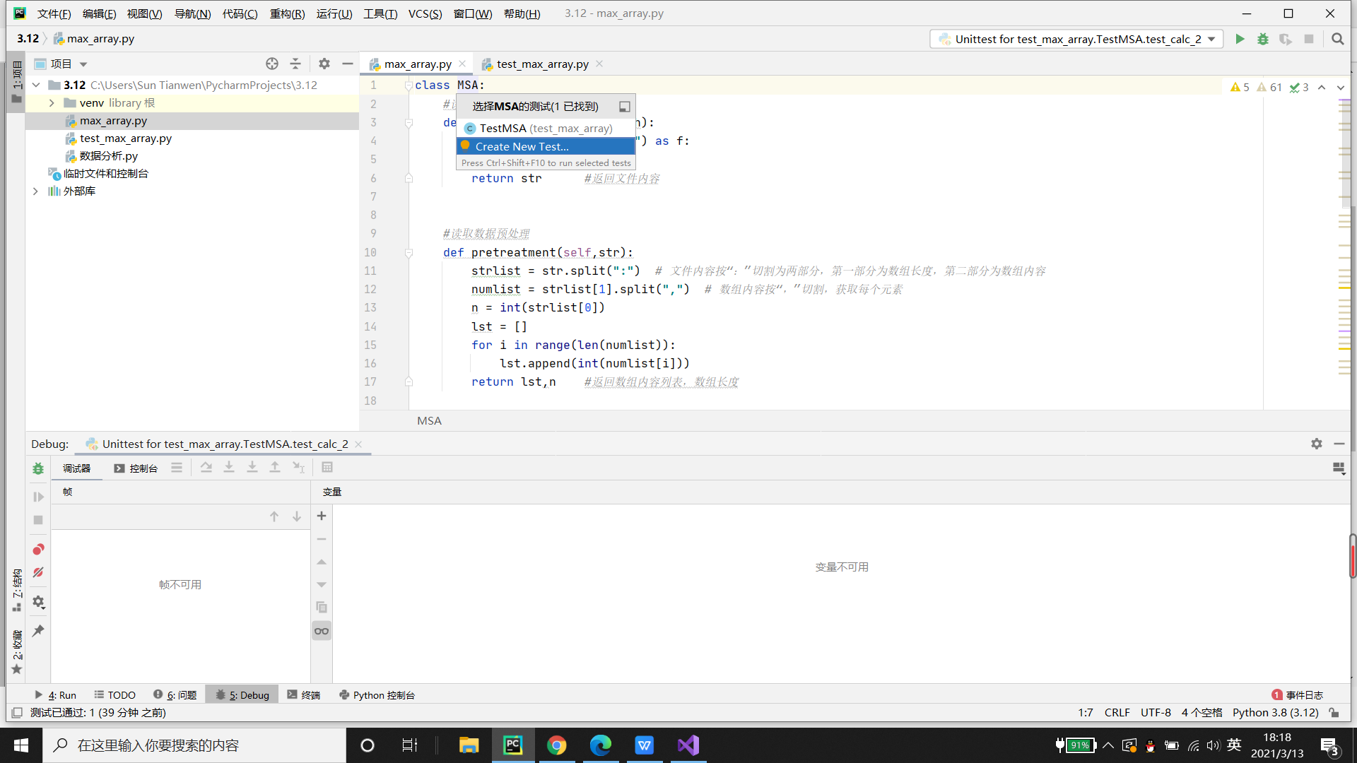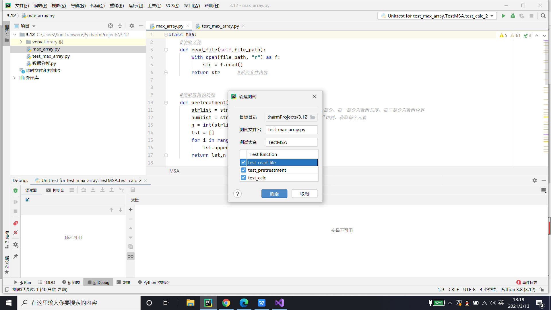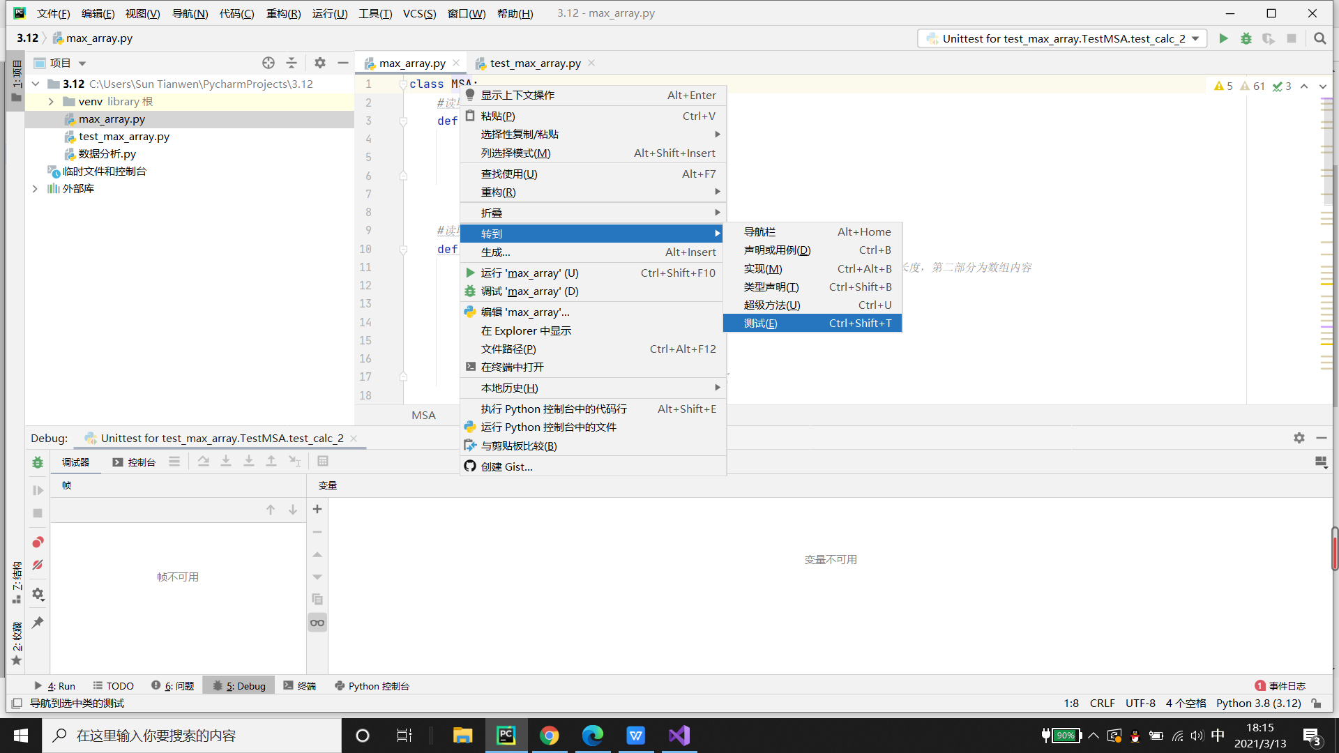 右键创建的类 -->转到-->测试-->Create new test-->输入文件名和勾选要测试的函数-->确定