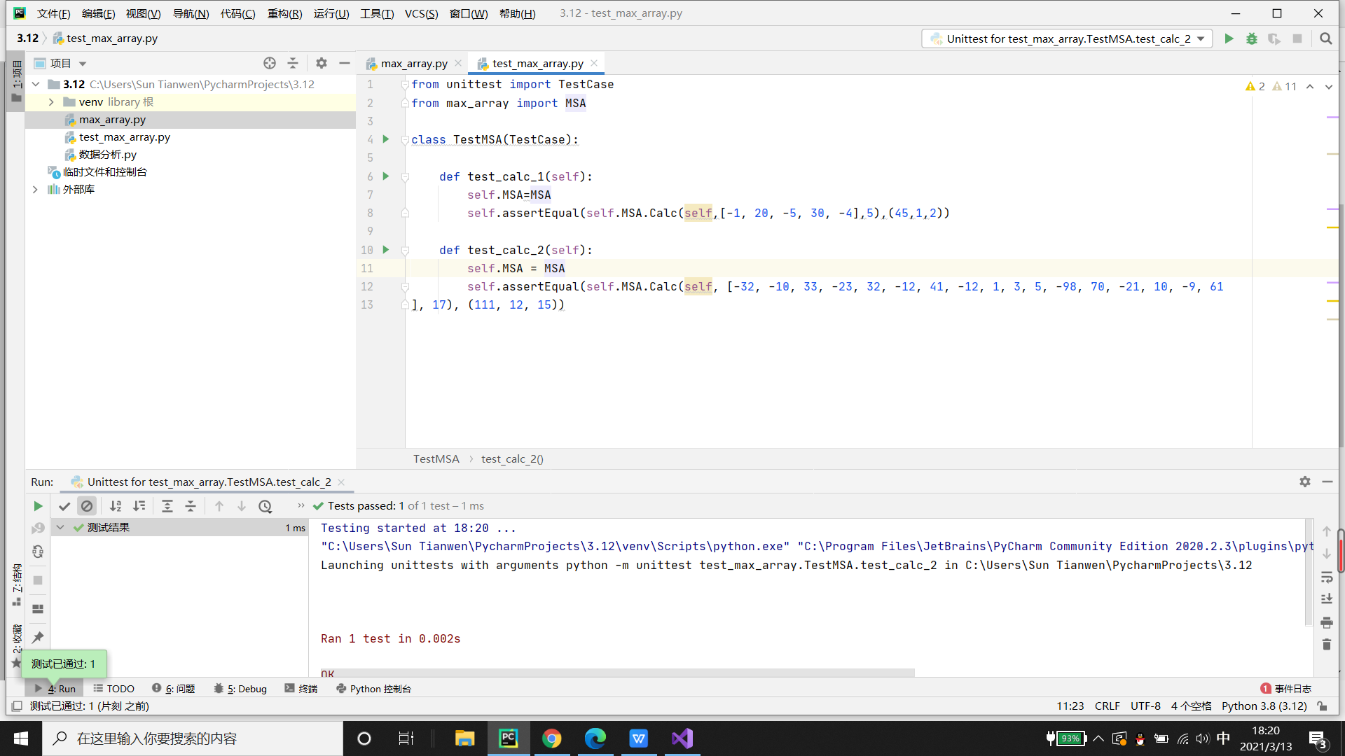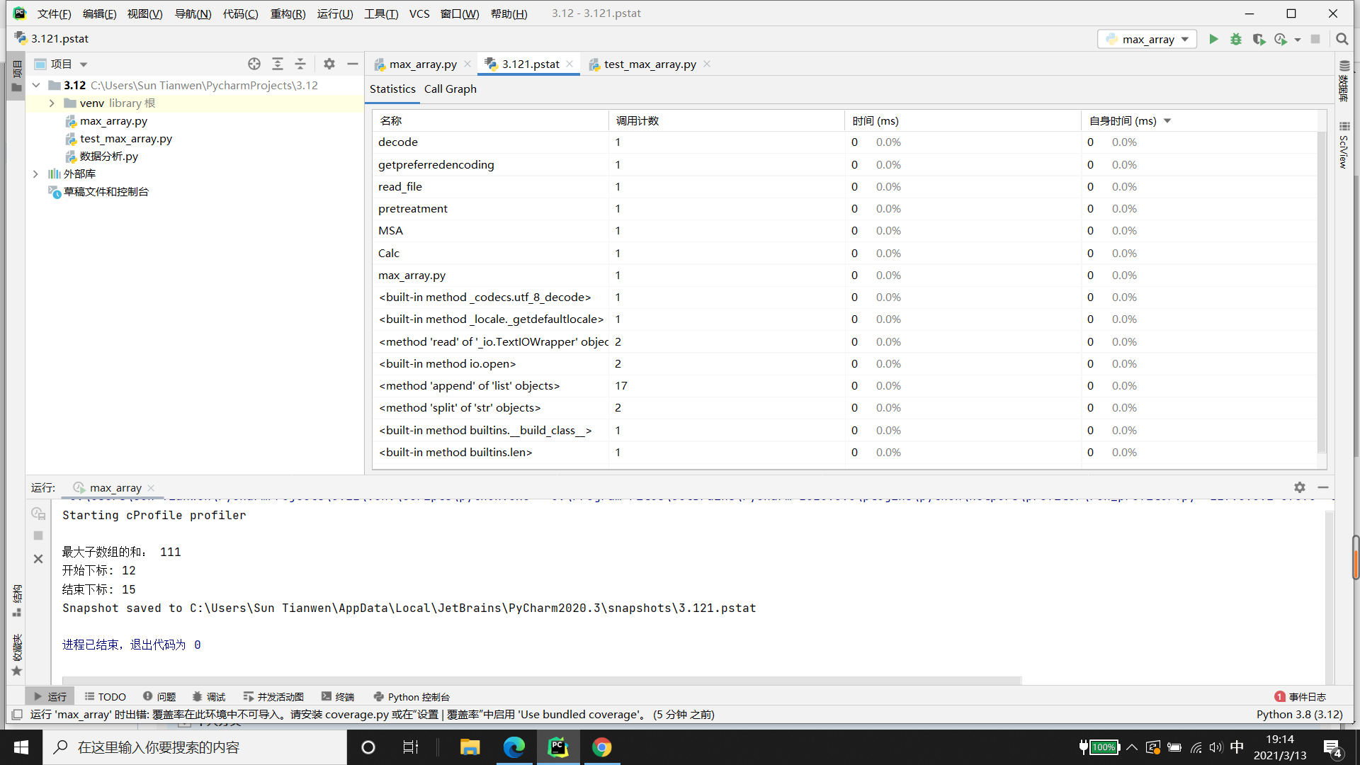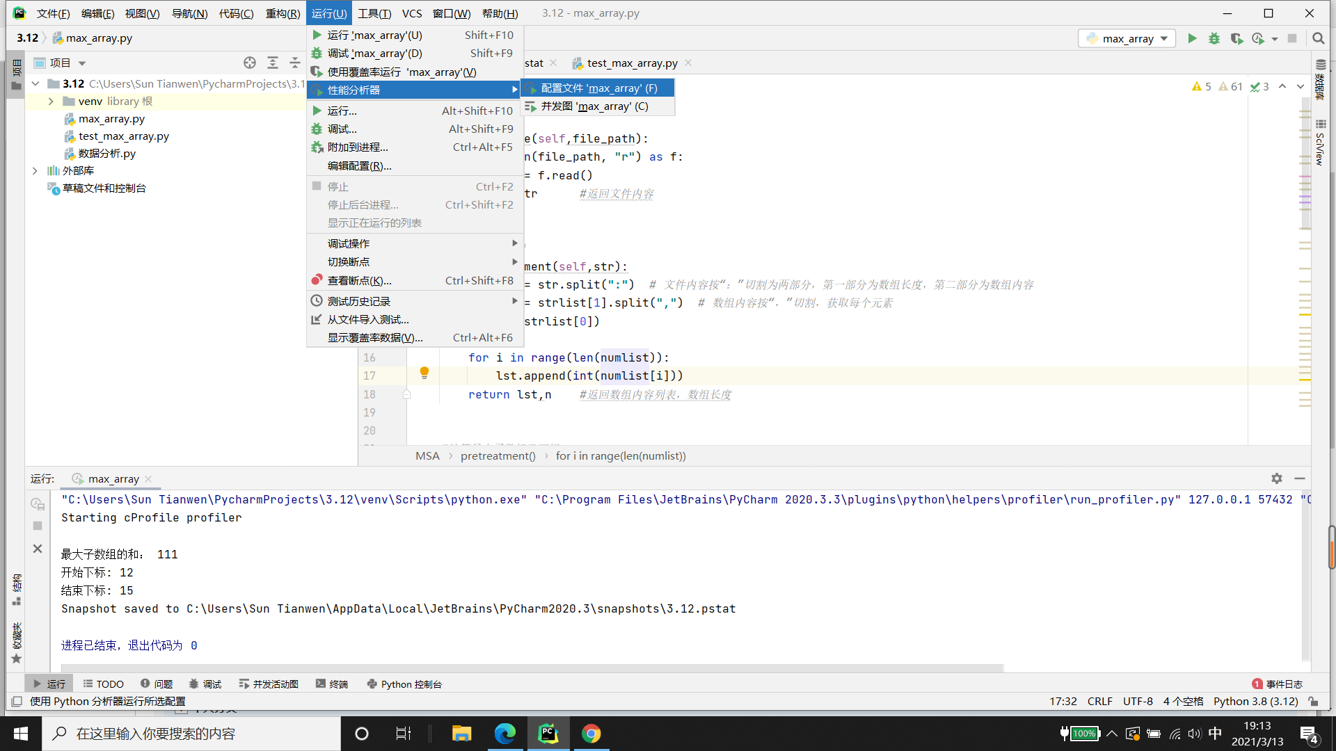 class MSA: #读取文件 def read_file(self,file_path): with open(file_path, "r") as f: str = f.read() return str #返回文件内容 #读取数据预处理 def pretreatment(self,file_path): str=self.read_file(file_path) strlist = str.split(":") # 文件内容按“:”切割为两部分,第一部分为数组长度,第二部分为数组内容 numlist = strlist[1].split(",") # 数组内容按“,”切割,获取每个元素 n = int(strlist[0]) lst = [] for i in range(len(numlist)): lst.append(int(numlist[i])) return lst,n #返回数组内容列表,数组长度 #计算最大子数组及下标 def Calc(self,file_path): lst,n=self.pretreatment(file_path) max = 0 for i in range(n): for j in range(i, n): sum = 0 for k in range(i, j+1): sum = sum + lst[k] if sum > max: max = sum begin = i end = j - 1 return max, begin, end #返回计算结果 if __name__=="__main__": file_path="C:/Users/Sun Tianwen/Desktop/data.txt" #文件路径 max=0 begin=0 end=0 msa=MSA() max,begin,end=msa.Calc(file_path) #求最大子数组之和及下标 print("最大子数组的和:",max) print("开始下标:",begin) print("结束下标:",end)