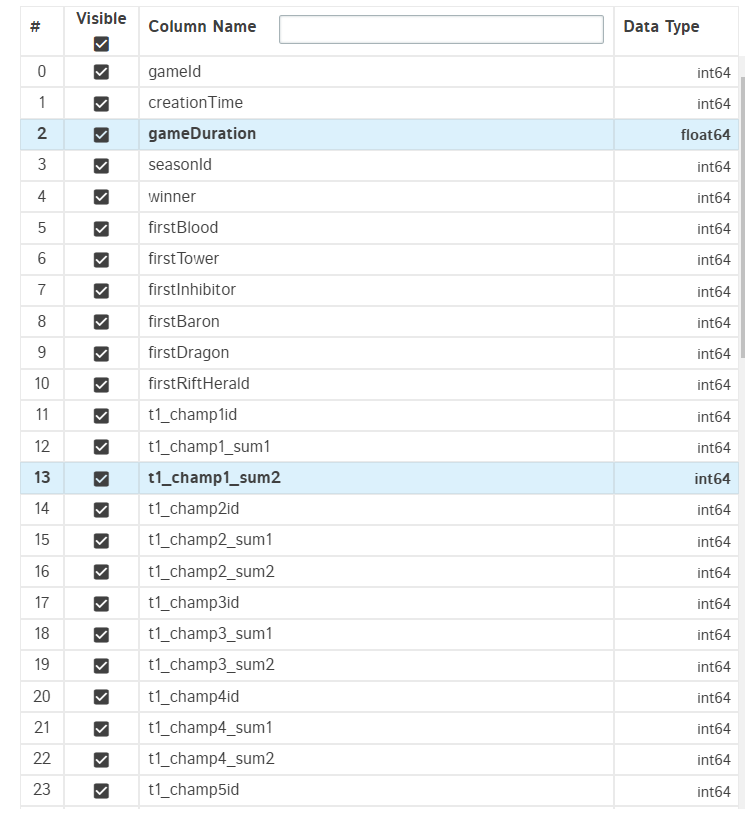 Champions and summoner spells for each team (Stored as Riot's champion and summoner spell IDs):每只队伍选择的英雄和召唤术(用英雄和召唤师技能编号表示)