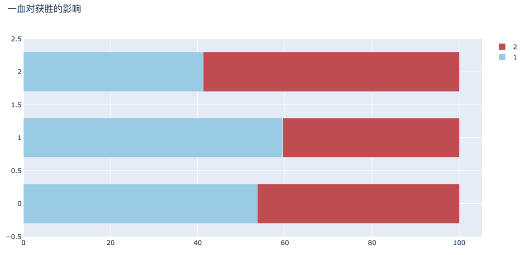获得一血的队伍胜率相对较高,在第一队的游戏中,首先获得一血时的胜率为59.48%,相较未获得一血的比赛高18%。在第二队的游戏中,获得一血时的胜率为58.72%,相较未获得一血的游戏高18%。