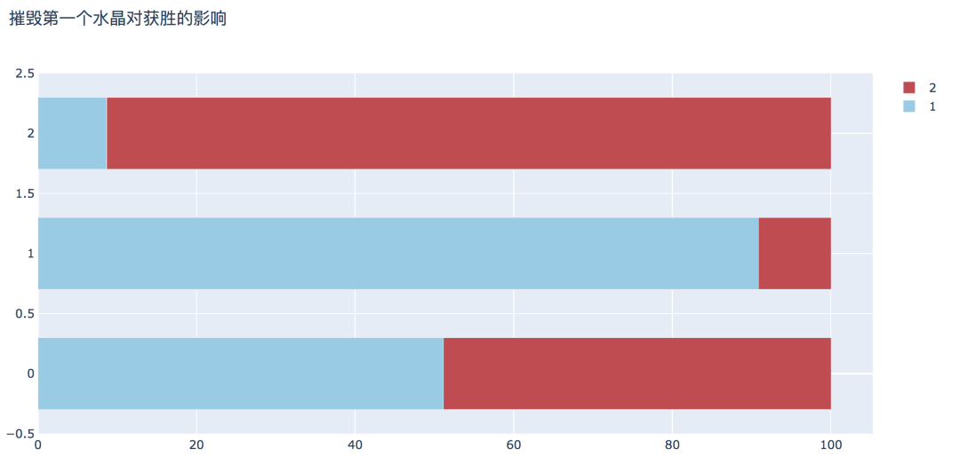 在游戏中拿到第一座水晶塔的队伍91%的情况下可以获胜,这一点在某种程度上是可以预见的,因为首先摧毁水晶塔代表队伍已经积累的足够的优势,而且水晶塔力量很强大,并且更具有价值。