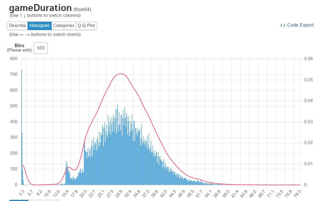 图中可以看出最短游戏时长为三分钟(有人挂机时,游戏三分钟允许投票重开),最长的游戏时长为78分钟,平均游戏时长30分钟。