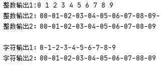 # 基础操作联系1:格式控制、列表解析、类型转换 x = list(range(10)) print('整数输出1:', end='') for i in x: print(i, end=' ') print('\n整数输出2:', end='') for i in x: print(f'{i:02d}', end='-') #指定每个整数输出宽度占两列,不足两列,左边补0 print('\n整数输出2:', end='') for i in x[:-1]: print(f'{i:02d}', end='-') print(f'{x[-1]:02d}') print('\n字符输出1:', end='') y1 = [str(i) for i in range(10)] #函数str()用于把其他函数类型转换成字符串对象 print('-'.join(y1)) print('字符输出2:', end='') y2 = [str(i).zfill(2) for i in range(10)] #方法.zfill()用于对字符串进行格式化,指定宽度为2列,不足左边补0 print('-'.join(y2))