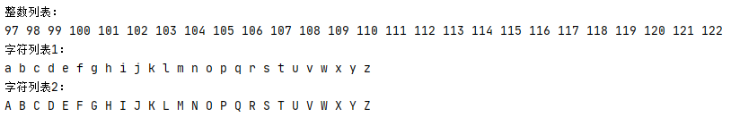 # 基础操作练习2:range对象、列表解析、类型转换、字符串方法 print('整数列表:') x = list(range(97, 97+26)) for i in x: print(i, end=' ') print('\n字符列表1:') lower_alpha = [chr(i) for i in range(97, 97+26)] #函数chr()返回整数对应的字符串形式 for i in lower_alpha: print(i, end=' ') print('\n字符列表2:') upper_alpha = [i.upper() for i in lower_alpha] # 方法.upper()用于把小写字母转换成大写 for i in upper_alpha: print(i, end=' ')