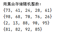 # 测试集合解析形式5:s = {random.randint(1, 100) for i in range(5)}生成集合,len(S)一定是5吗? import random print('用集合存储随机整数:') while True: s = {random.randint(1, 100) for i in range(5)} print(s) if len(s) < 5: break